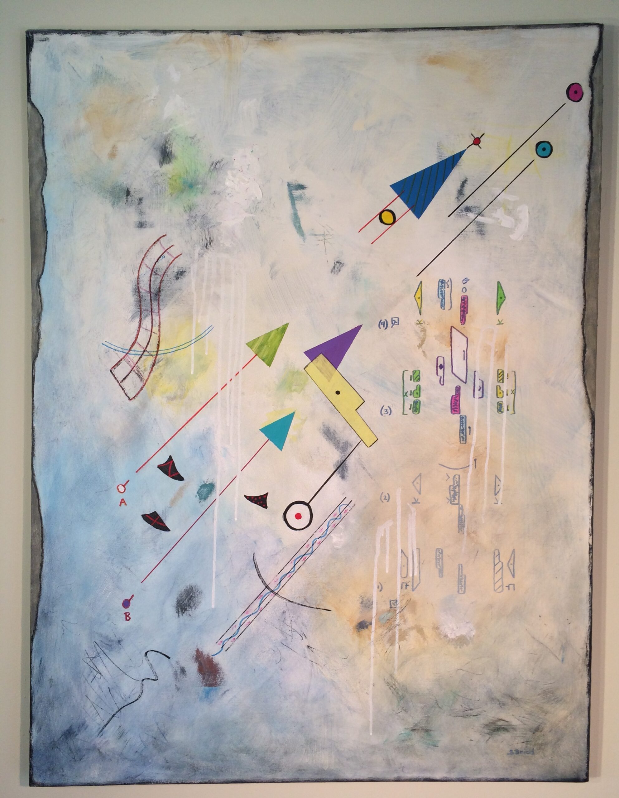 30″w x 40″h acrylic and ink on canvas – Labanotation symbols in pure design, readable phrase emerges from the fog